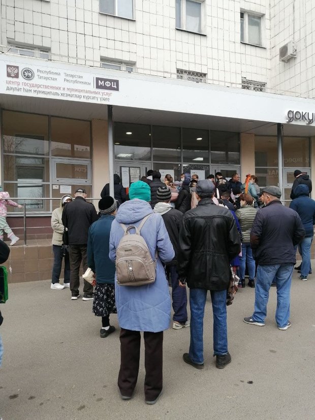На прошлой неделе у казанских офисов МФЦ образовались очереди из людей, желающих подтвердить учетную запись на «Госуслугах» для получения QR-кода. В соцсетях люди делились кадрами из разных офисов МФЦ, на которых толпы людей буквально штурмуют организации.