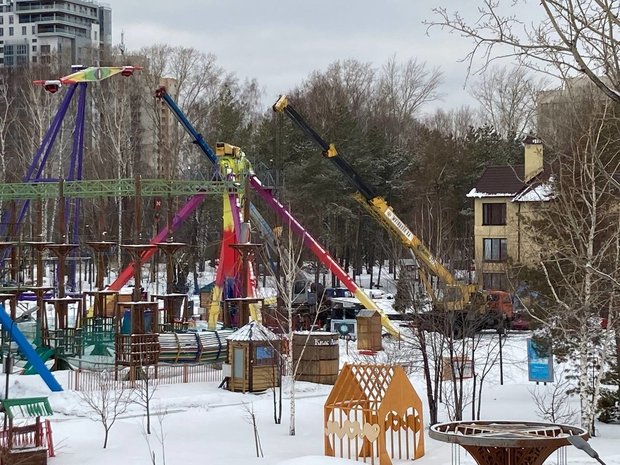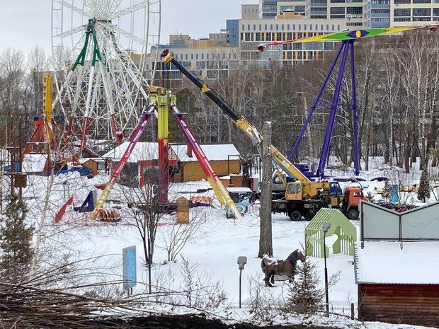 На участке работают кран, погрузчик и автовышка. Рабочие приступили к разбору аттракционов: сидений нет у цепочной карусели и «Летающей тарелки».