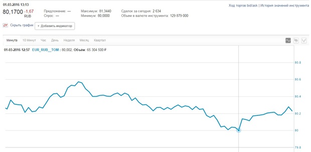 Центробанк опустил официальный курс евро на 2,6 рубля, на бирже евро упал до 80 рублей