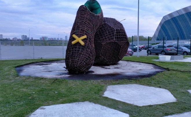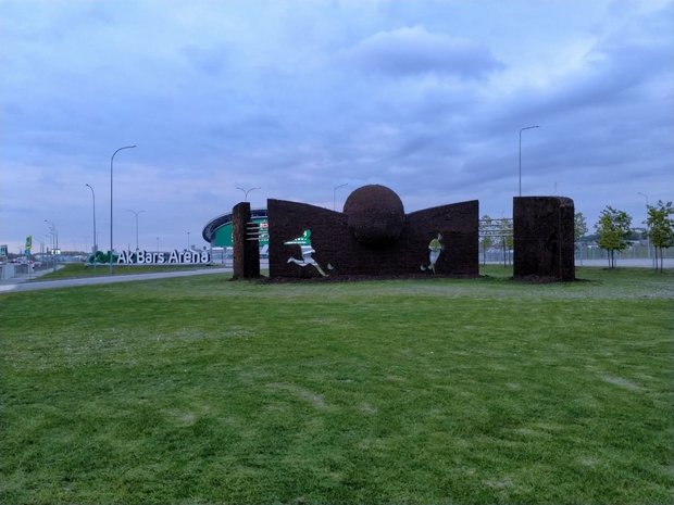 К летнему сезону обновляются арт-объекты, установленные на лужайке недалеко от стадиона. Композиции выполнены на спортивную тему — есть фигуры в виде гигантского футбольного мяча, спортивной обуви, футболистов, забивающих голы. Пока они заполнены лишь слоем земли. Затем на них посадят цветы, растения или траву.