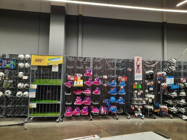 Некоторые из отделов полностью скуплены и большая часть магазина обставлена пустыми полками.