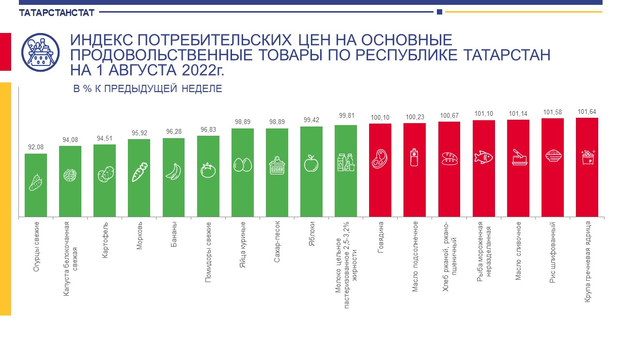 Незначительно меньше чем на 1% в Татарстане подорожали ржаной, ржано-пшеничный хлеб, сычужные твердые и мягкие сыры, подсолнечное масло, вареная колбаса и говядина. Не изменились в конце июля цены на пшено и баранину.
