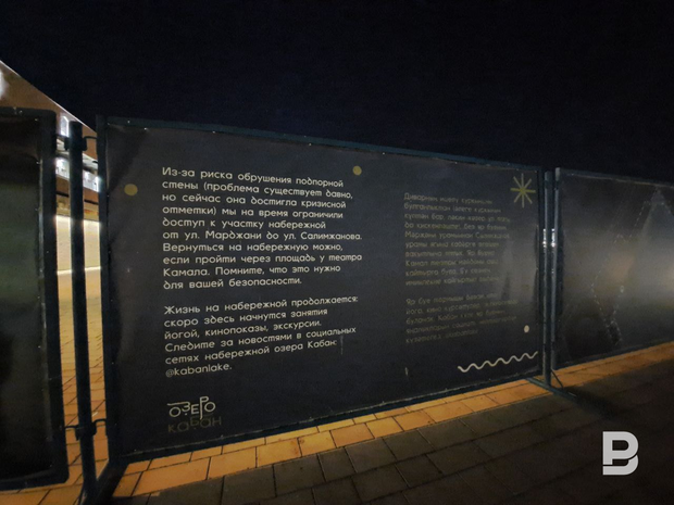 Ненадежной защитой оказались синие баннеры, размещенные на площади перед театром Галиаскара Камала и со стороны Старо-Татарской слободы, чтобы не допустить людей на опасный участок набережной озера Нижний Кабан, закрытый еще в мае этого года. Как оказалось, их можно легко отодвинуть и проникнуть за огороженную часть, в чем накануне вечером лично убедился корреспондент «Реального времени».