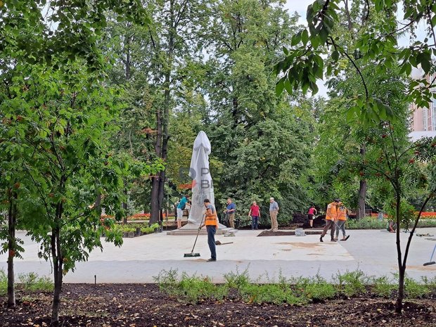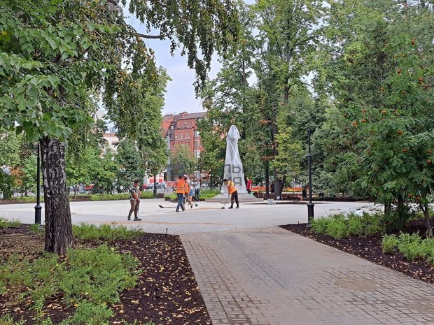В сквере уложили новую брусчатку. Рабочие высаживают растения вдоль дорожек и на клумбах возле памятника, а также очищают площадь.