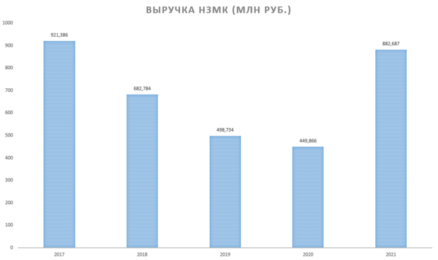 Однако на следующий год ситуация кардинально изменилась: выручка НЗМК составила рекордные за четыре года 882,7 миллиона. Большая выручка завода отмечалась только в 2017 году — 921,4 миллиона. Увеличение выручки почти в два раза, тем не менее, не повлияло на то, что в 2021 году предприятие снова ушло в убыток, но уже на 4 миллиона рублей.