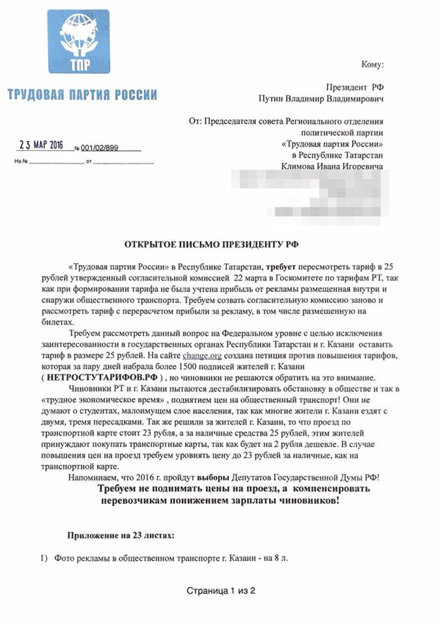 Татарстанское отделение «Трудовой партии России» 23 марта написало открытое письмо президенту РФ Владимиру Путину с требованием взять на контроль ситуацию с повышением тарифа на проезд в общественном транспорте Казани.