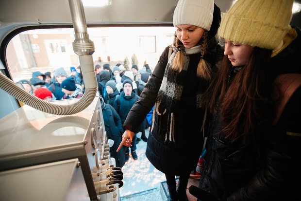 Знакомство школьников с этой передвижной лабораторией длилось около часа. Несмотря на мороз, школьники не спешили расходиться, с интересом рассматривали оборудование, задавали вопросы.