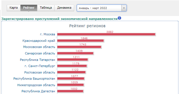 Аналогичный расклад сохранился и по итогам января — мая 2022 года — пол количеству выявленных преступлений экономической направленности (1 866) республика по-прежнему занимала 6-е место рейтинга Генпрокуратуры. В первой пятерке были Москва, Краснодарский край, Санкт-Петербург, Московская и Самарская области.