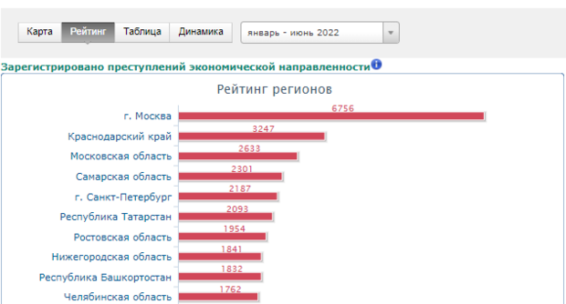 По итогам первого полугодия 2022 года количество зарегистрированных преступлений экономической направленности в Татарстане перешагнуло отметку в 2 тысячи. Несмотря на это, республика в рейтинге не поднялась — по итогам января — июня она продолжала занимать 6-ю строчку. Топ-5 остался практически без изменений — все те же регионы, но в другой последовательности, с традиционным «лидерством» Москвы.