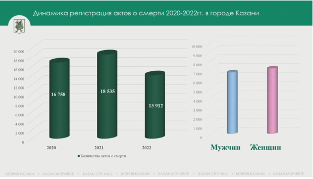 В 2022 году в Казани смертность по сравнению с предыдущим годом сократилась на четверть. Об этом на «деловом понедельнике» сообщила начальник городского Управления записи актов гражданского состояния Римма Миннуллина.