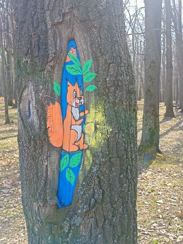 Изображениями лесной флоры и фауны ребята украшают открытые растрескавшиеся стволы деревьев — морозобоины. Защитный слой, который наносится акриловыми красками, помогает предотвращать уничтожение растений насекомыми-вредителями.