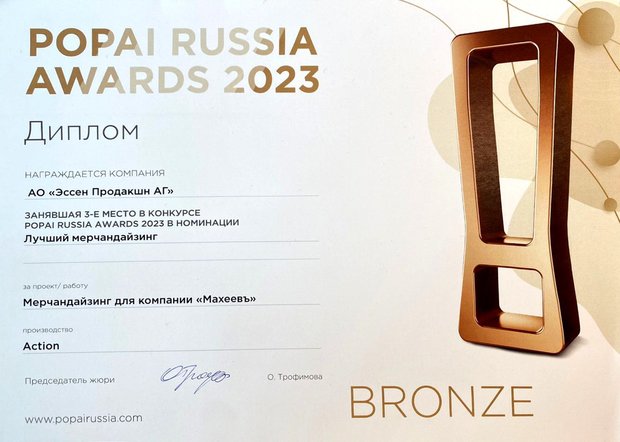 В Москве состоялась торжественная церемония награждения победителей конкурса POPAI RUSSIA AWARDS 2023. Компания «Эссен Продакшн АГ» с проектом «Скорого мерчандайзинга» для бренда «Махеевъ» заняла третье место в номинации «Лучший мерчандайзинг».