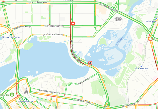 Водителям, едущим со стороны улицы Фатыха Амирхана, придется преодолеть затор длиной в 2 км. Пробка начинается со стороны улицы Четаева.