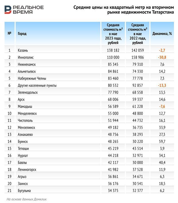 В целом в большинстве татарстанских городов средняя цена квадратного метра на вторичном рынке по сравнению с маем прошлого года, наоборот, выросла. В Нижнекамске рост составил 7,6% (85 345 рублей за кв. м), в Альметьевске — 14,2% (84 861 рубль за кв. м), в Набережных Челнах — 7,3% (83 460 рублей за кв. м).
