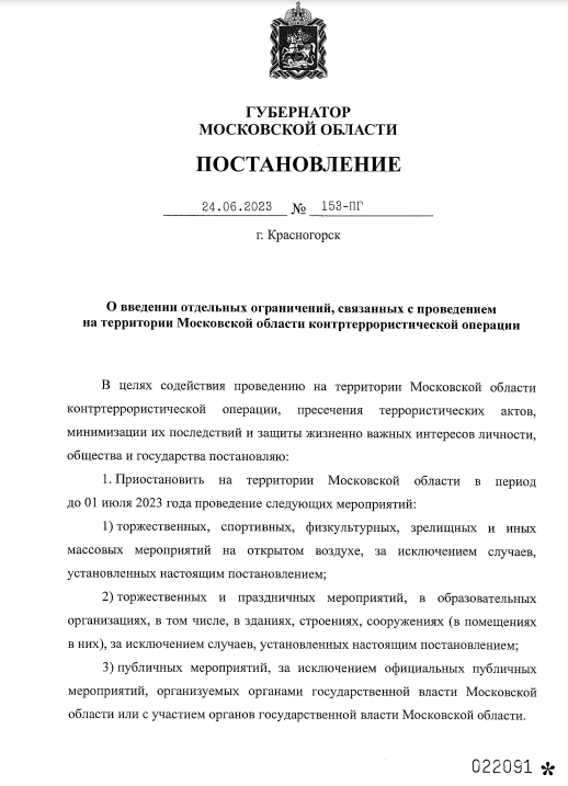 В документе сказано, что в Московской области приостановили проведение публичных, массовых, торжественных, спортивных и других мероприятий. В указанный период в области возможно лишь проведение официальных мероприятий, которые организованы властями Московской области либо проводятся с их участием.