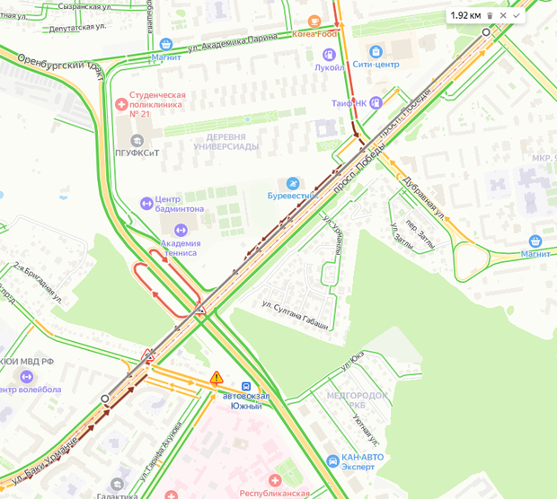 По данным сервиса «Яндекс.Карты», пробка в сторону улицы Баки Урманче начинается от улицы Фучика. Ее протяженность по состоянию на 19.20 11 июля составила чуть меньше двух километров.