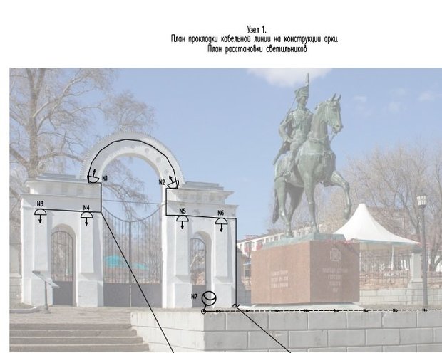 Проектом предусматривается наружное архитектурное освещение памятников монументального искусства, фасадов исторических зданий, объектов культурного наследия; подсветка макетов, электроснабжение модульных туалетов. Для наружного (архитектурного) освещения применены светодиодные светильники. Работы планируется завершить в декабре 2023 года.