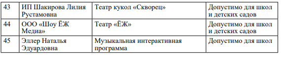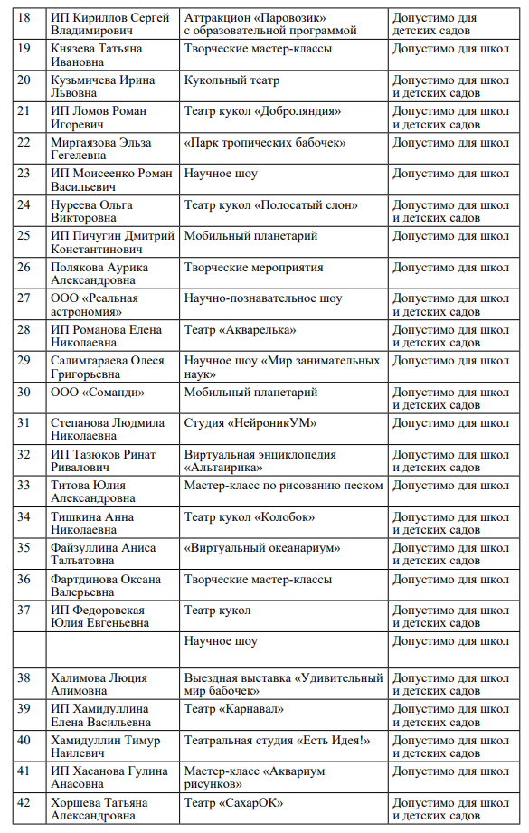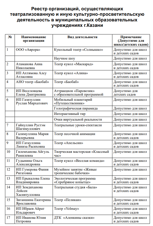 Все организации указаны с примечаниями либо «допустимо для школ», либо «допустимо для детских садов», либо «допустимо для школ и детских садов». В числе последних, например, ООО «Аврора» с кукольным театром «Солнышко», Анна Атаманова с театром кукол «Маскарад», ИП Алсу Ахтямова с театром кукол «Алина», АНО театр «Баобаб», Мария Галимуллина с театром песочной анимации, ИП Линиза Гатауллина с театром «Апельсин», Ольга Гудынина с театром кукол «Веселая команда», ИП Елена Ерыкалова с экологической программой «Серебряное копытце» и так далее.