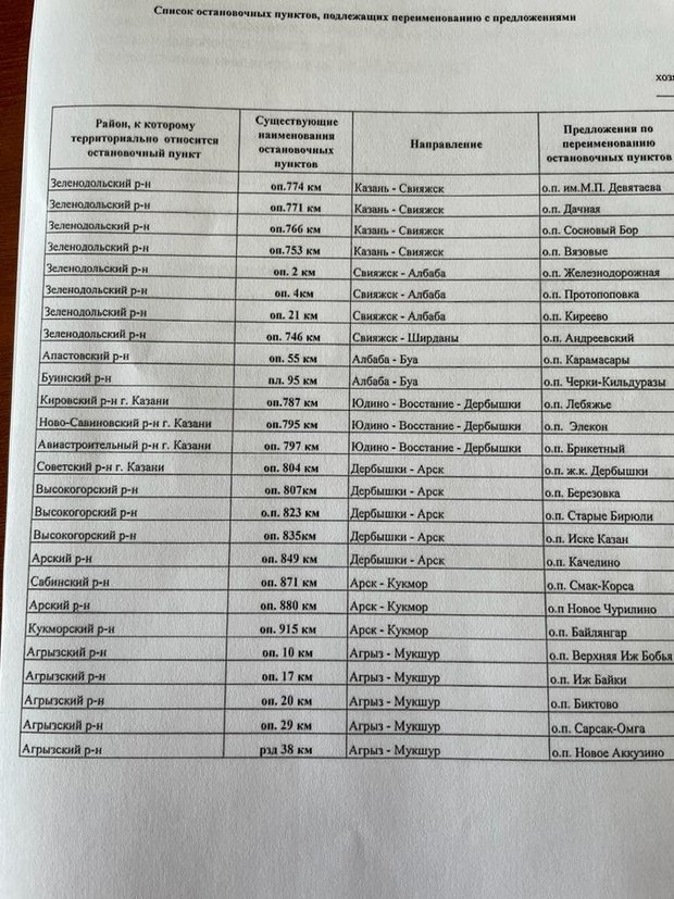 Так, к примеру, в Зеленодольском районе хотят переименовать восемь станций: «771 км» получит название «Дачная», «766 км» — «Сосновый Бор», «787 км» — «Лебяжье». Переименование ожидается по направлению Казань — Свияжск, Свияжск — Албаба, Свияжск — Ширданы, Албаба — Буа, Юдино — Восстание — Дербышки, Дербышки — Арск, Арск — Кукмор. Правда, список с новыми названиями пока находится на согласовании в руководстве РЖД.