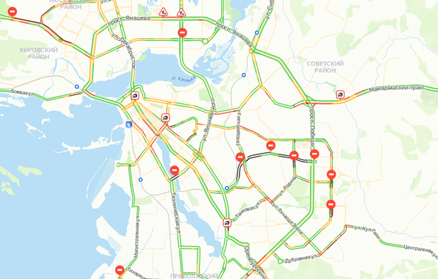 Движение затруднено в Кировском районе Казани. Так, пробки ждут автомобилистов на Горьковском шоссе, Восстания, Болотникова и Кулахметова.