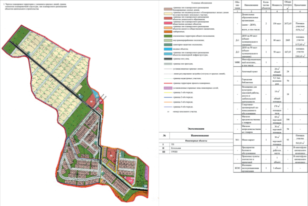 Площадь территории проекта планировки и межевания составляет 23,6 га. Из них под индивидуальные и блокированные жилые дома — как существующие, так и проектируемые — отведено 11,3 га, под дошкольные образовательные организации — 0,5 га; под объекты торговли, культурно-бытового обслуживания — 0,2 га, территории улиц и проездов — 5,48 га; озелененные территории общего пользования — 4,4 га; территория под инженерные сооружения составит 0,1343 га.