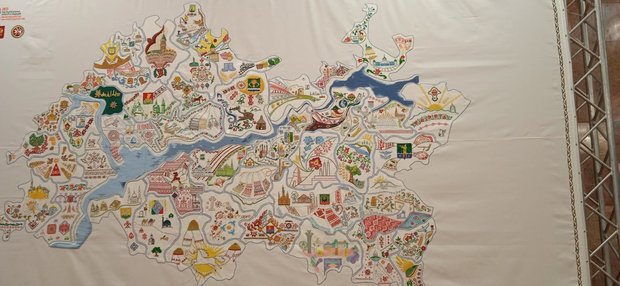 Первому президенту Татарстана, Государственному Советнику Минтимеру Шаймиеву сегодня показали вышитую карту республики — полотно с изображением национальных особенностей каждого из 45 районов, выполненных в присущей им технике шитья. Выставка достижений народно-художественных промыслов проходила в зале Госсовета РТ, краткую экскурсию провела министр культуры РТ Ирада Аюпова. Каждому из 45 районов РТ присуща своя техника вышивки: тамбурная, гладью, крестиком, ушковая, отметила она.