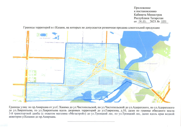 Постановлением определены границы территорий, где 21 октября в Казани запрещается розничная продажа алкоголя: по проспекту Амирхана, от ул. Сибгата Хакима до ул. Чистопольской, по ул. Чистопольской до ул. Адоратского, по ул. Адоратского до ул. Лаврентьева, по ул. Лаврентьева вдоль дворовых территорий до ул. Гаврилова, 10, далее по границе обводного моста Третьей транспортной дамбы до ул. Троицкий Лес, а затем вдоль края водной акватории Казанки до проспекта Амирхана.