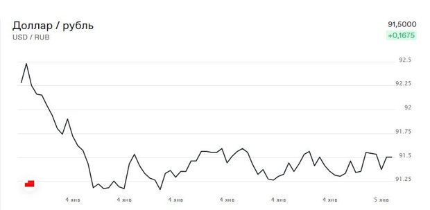 На третий день с момента начала торгов на Московской фондовой бирже после наступления нового года российская валюта пытается удержаться в коридоре 91—92 рубля за американский доллар. 5 января на старте пара USD/ RUB торговалась на уровне 91,46 рубля за $1, что на 13 копеек дороже в сравнении с результатами закрытия предыдущих торгов. По состоянию на 9,01 мск рубль продолжил падение, уступив еще 4 копейки.