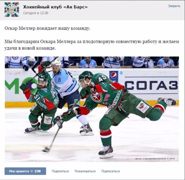 Форвард «Ак Барса» покинул команду 17:17, 28.04.2016 Фото: Реальное время Форвард казанского «Ак Барса» Оскар Меллер покинул команду, сообщает официальное сообщество клуба ВКонтакте.Ранее сообщалось, что Меллер вернется в свой бывший клуб «Шеллефтео». Подписывайтесь на телеграм-канал, группу «ВКонтакте» и страницу в «Одноклассниках» «Реального времени». Ежедневные видео на Rutube и «Дзене».