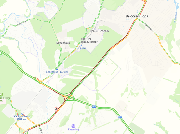 Больше, чем на 6 километров растянулась пробка по направлению из Высокой Горы в сторону Казани. На карте движение по этому участку трассы М-7 помечено бордовым цветом. Известно как минимум об одном ДТП.