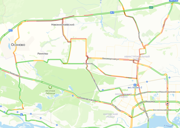 Значительно затруднено движение в Кировском, Московском и Авиастроительном районах Казани. Пробки тянутся практически от въездов в город и до самой Казанки. Особенно тяжело ситуация обстоит рядом с поселком Новониколаевским.