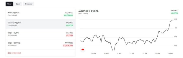 На открытии торгов 1 февраля курс доллара к рублю составил 89,95 рубля. По сравнению с уровнем закрытия предыдущих торгов снижение составило 6,5 копейки.