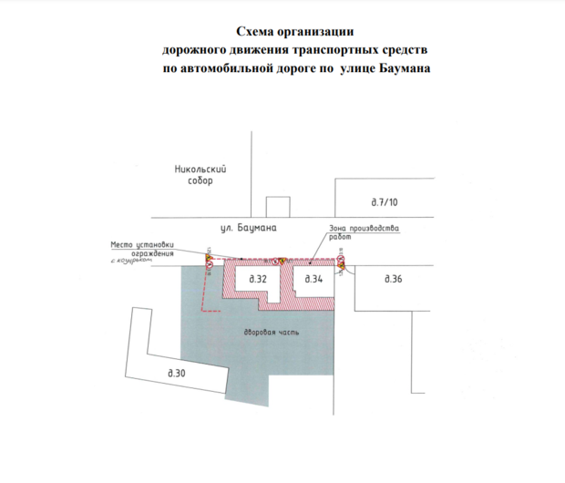 Участок улицы Баумана будет перекрыт в районе зданий №32 и №34 до 1 сентября этого года.