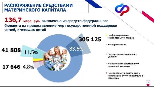 Более 305 тысяч семей пользуются средствами материнского капитала для улучшения жилищных условий, что составляет 83,6% от всех семей, 42 тысячи семей отправили деньги на образование детей, а 17,6 тысячи родителей отправили маткапитал на получение ежемесячной денежной выплаты. Остальные же направили средства, выделенные программой, на формирование накопительной пенсии и социальную адаптацию и интеграцию детей-инвалидов в общество.
