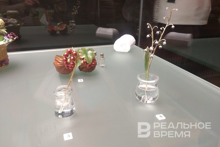Миниатюрная вазочка, в которой в воде стоит изящная веточка ландыша, — работа знаменитого Фаберже, при внимательном взгляде — пустая. Галия Шакирова / realnoevremya.ru