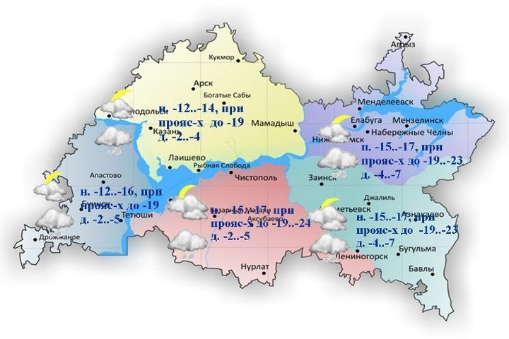 По прогнозу Гидрометцентра Татарстана в столице республики ожидается переменная облачность, местами небольшой снег. Ветер юго-западный 4—9 м/с, местами порывами до 13 м/с. На дорогах может быть гололедица.