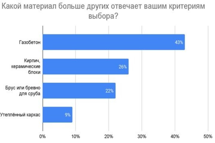 Кроме того, участникам исследования предложили выбрать строительный материал, который, по их мнению, больше прочих соответствует сумме озвученных ожиданий. Большинство респондентов (43%) полагают, что это газобетон. На втором месте расположились кирпич и керамические блоки, а тройку замыкают древесные материалы.