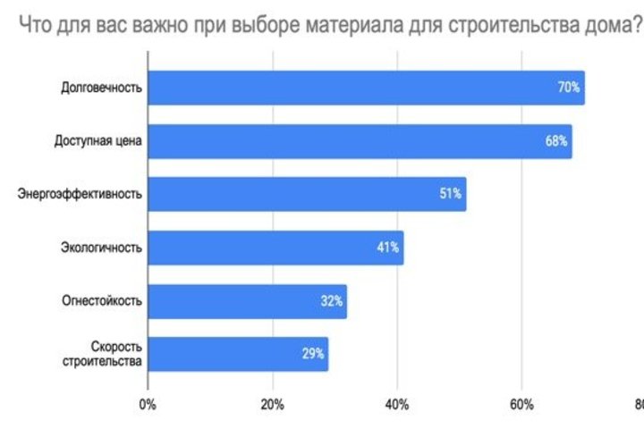 Самой востребованной оказалась долговечность, на которую указали 70% опрошенных. Для 68% респондентов почти так же важна доступная цена, третье место заняла энергоэффективность: ее принимает в расчет 51% будущих домовладельцев.