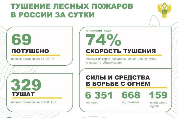 За последние сутки было ликвидировано 11 пожаров на площади свыше 5,4 тыс. гектаров. В тушении участвовали 1 696 человек и 113 единиц техники от различных структур РСЧС.