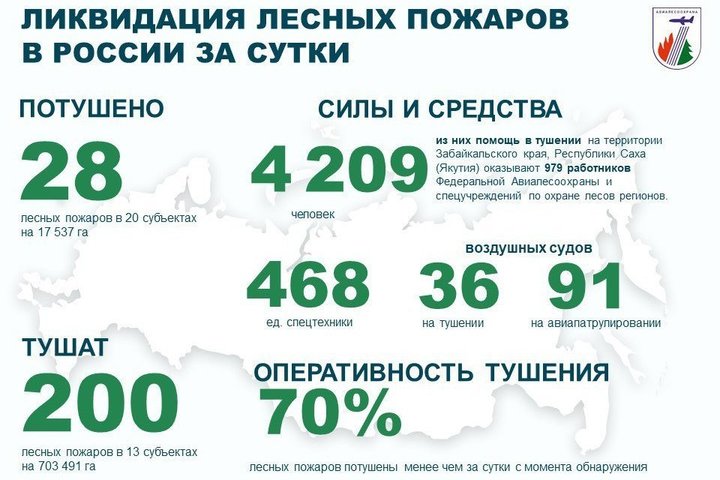 В тушении пожаров принимают участие 4 209 человек, задействовано 468 единиц техники и 36 воздушных судов. Кроме того, проводится авиационный мониторинг обстановки — в воздухе находится 91 воздушное судно.
