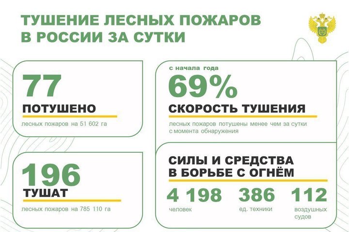 За прошедшие сутки в 16 регионах России потушили 77 лесных пожаров. Продолжается ликвидация 196 очагов возгорания в 14 субъектах страны.