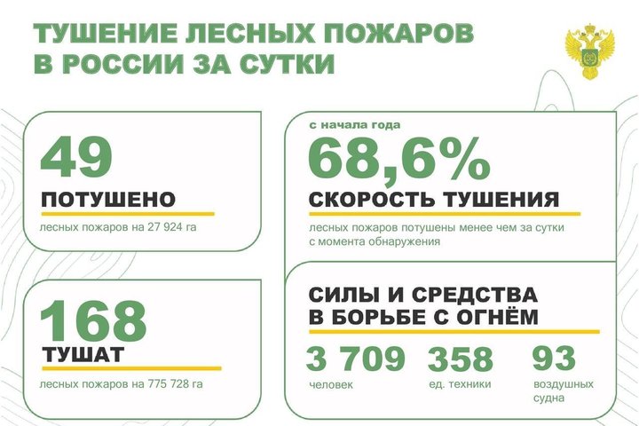 Для тушения пожаров привлечены значительные ресурсы: задействованы 3 708 человек, 358 единиц спецтехники и 93 воздушных судна.