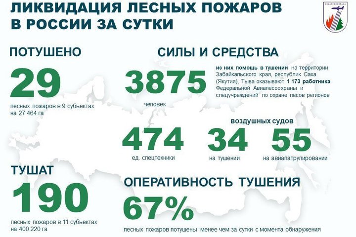По данным ведомства, к полуночи воскресенья на территории России активно тушили 190 лесных пожаров на площади 400 220 гектаров. Наибольшая площадь пожаров зафиксирована в Якутии — там действовало 64 пожара на 324 244 гектарах.