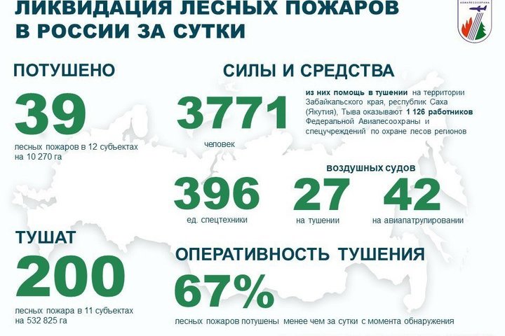 За минувшие сутки в 12 регионах России было потушено 39 лесных пожаров. На текущий момент проводятся работы по тушению 200 пожаров в 11 регионах страны, докладывает Федеральная «Авиалесоохрана».