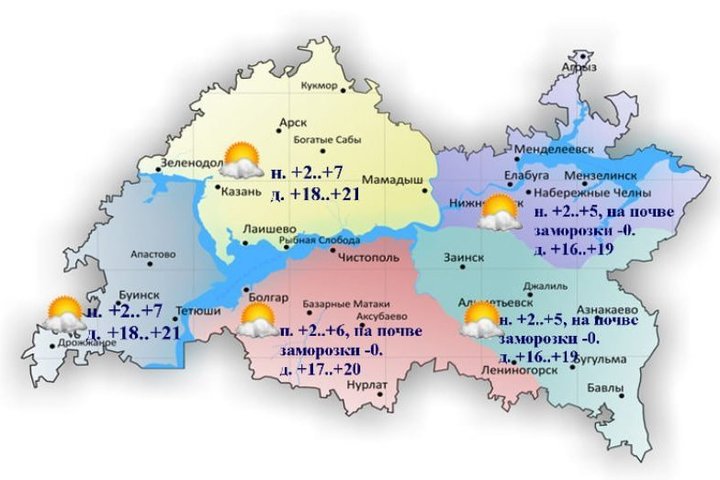 Ночью температура воздуха опустится до +2... +7 градусов, местами до нуля градусов (в Казани до +5... +7 градусов). Днем столбики термометров покажут +16—21 градус.