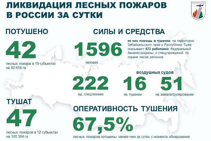 За прошедшие сутки пожарные службы и привлеченные лица потушили 42 лесных пожара в 19 регионах России. В настоящее время продолжаются работы по тушению 47 пожаров в 12 регионах страны, сообщает Федеральная «Авиалесоохрана».