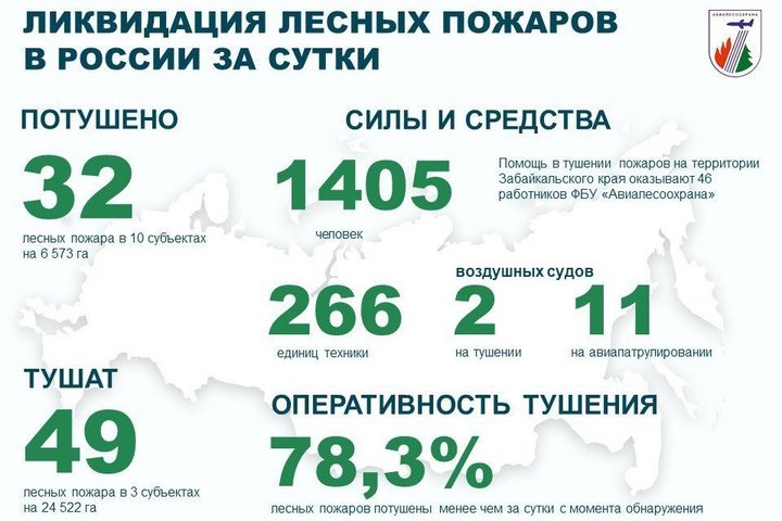 В настоящее время продолжаются работы по тушению 49 лесных пожаров. В ликвидации возгораний задействовано 1405 человек и 266 единиц техники. Авиационный мониторинг осуществляет два воздушных судна.