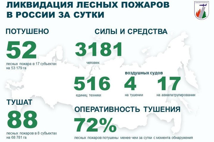 За прошедшие сутки в стране было потушено 52 лесных пожара в 17 регионах. В настоящее время продолжаются работы по тушению 88 лесных пожаров в восьми регионах. В борьбе с огнем задействованы: