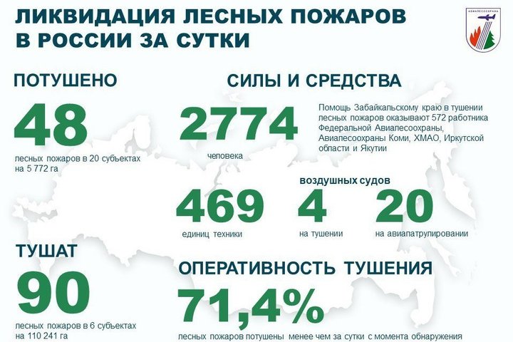 Наиболее сложная обстановка сохраняется в Забайкальском крае, где на тушении пожаров работают 292 сотрудника ФБУ «Авиалесоохрана», а также специалисты из Якутии, Коми, ХМАО и Иркутской области — всего 542 человека.