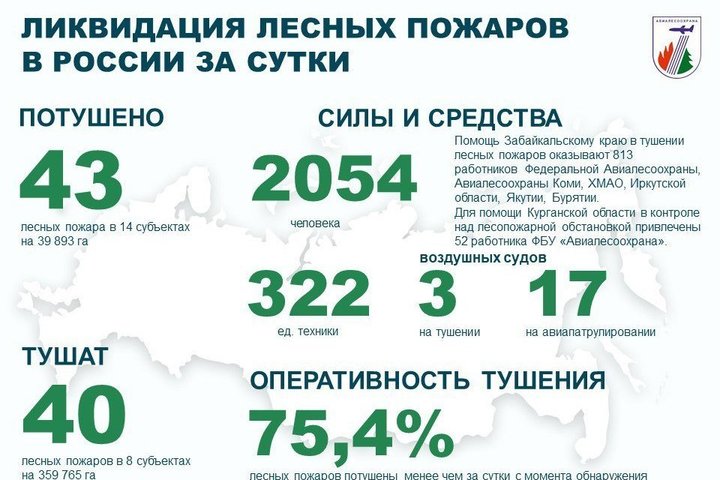 Наиболее сложная ситуация складывается в Забайкальском крае, где для помощи в тушении лесных пожаров направлен 781 работник федеральной «Авиалесоохраны», «Авиалесоохраны» Коми, ХМАО, Иркутской области, Якутии и Бурятии.
